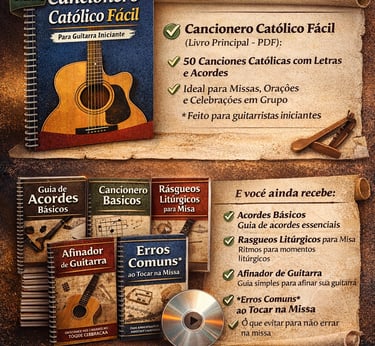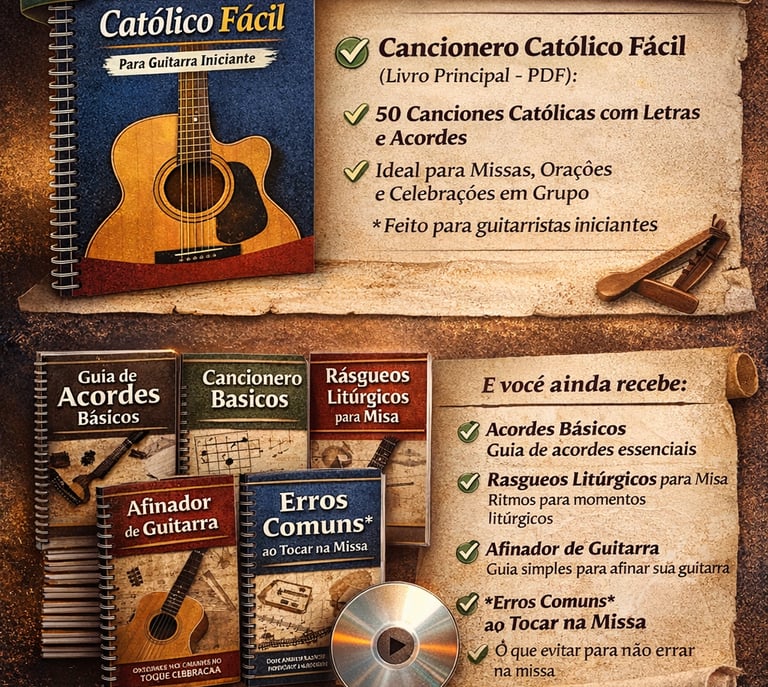Es un material exclusivo que contei 80 canciones católicas con acordes sencillos y diagramas, dirigidas a quienes quieran tocar la guitarra en misas, oraciones y celebraciones, incluyendo enlaces a vídeos y bonificaciones adicionales (acordes, patrones de rasgueo, afinador, errores comunes).